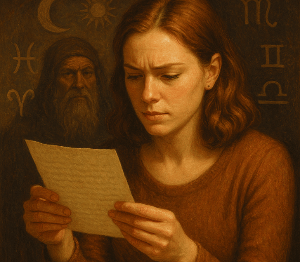 집중한 표정으로 종이를 읽는 여성 인물이 바넘 효과의 대표적인 상황을 묘사하며, 배경 속 신비로운 분위기의 점성술사와 황금빛 점성술 기호가 모호한 정보를 신뢰하는 심리를 강조하고, 따뜻한 색감과 부드러운 조명이 현실적인 묘사와 심리적 긴장감을 연출한다.