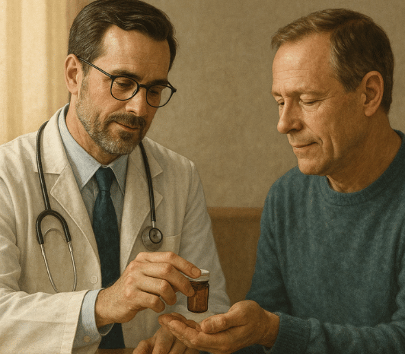 의사가 신뢰감 있는 표정으로 작은 약병을 환자에게 건네며, 환자는 기대감과 차분한 표정으로 이를 받아들이는 모습이 따뜻한 조명과 현실적인 질감 속에서 사실적으로 표현된 장면