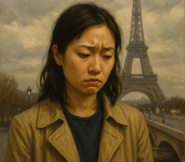 파리 신드롬 을 겪는 동아시아 여성을 묘사한 것으로, 그녀의 실망과 당혹스러운 표정이 이상화된 기대와 현실의 차이에서 오는 심리적 충격 을 상징적으로 표현하고 있다.