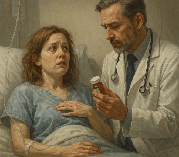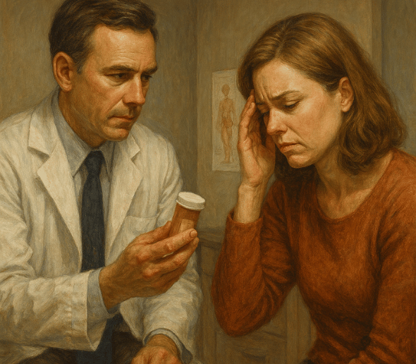 의사의 신중한 설명을 듣고 불안한 표정으로 약을 바라보는 환자의 모습이, 부정적인 기대가 실제 신체 반응을 유발할 수 있다는 노세보 효과의 심리적 메커니즘을 사실적으로 표현하고 있다.